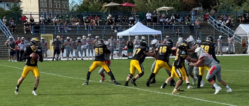 Die Adler-Defensive dominierte den Angriff der Gastgeber von Anfang an. Magdeburg blieb die gesamte erste Halbzeit ohne First Down und konnte auch nach der Pause nichts Zählbares auf’s Scoreboard bringen. Zwei forcierte und eroberte Fumbles trugen ebenfalls dazu bei.
